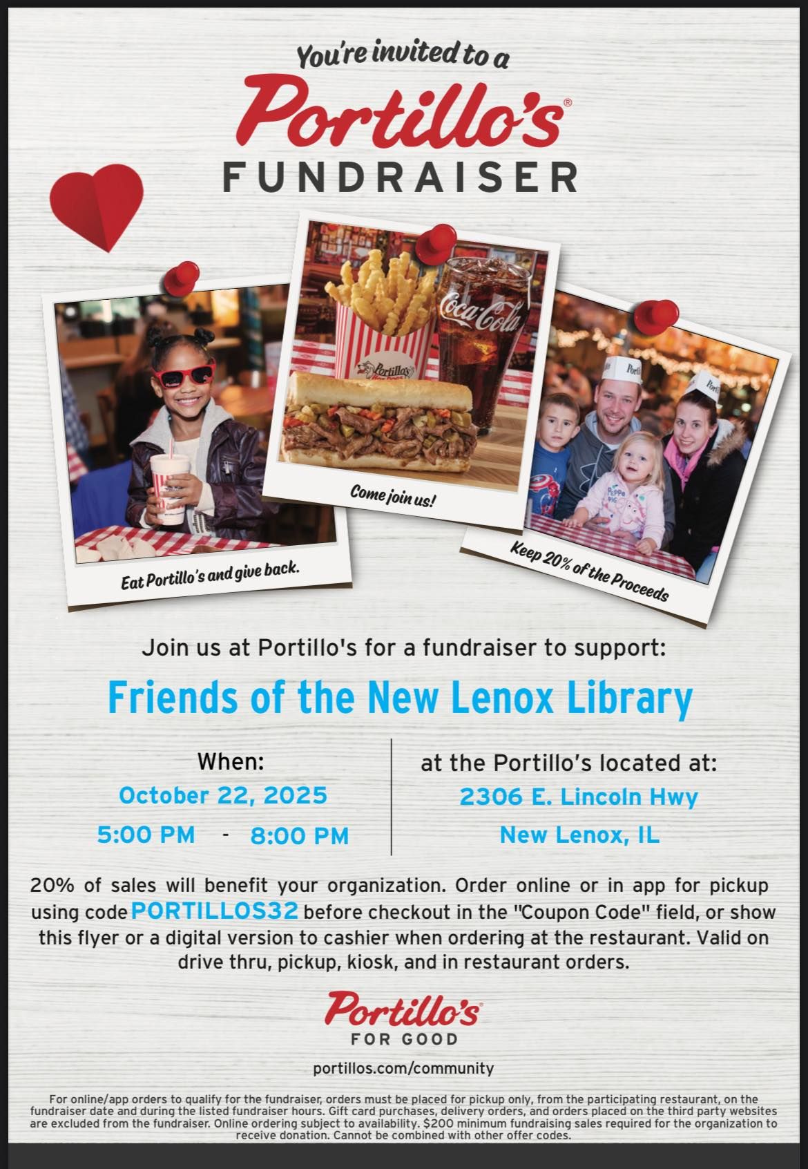 📍 Oct 22 - Portillo’s Fundraiser to Support Local Library (New Lenox) - Details